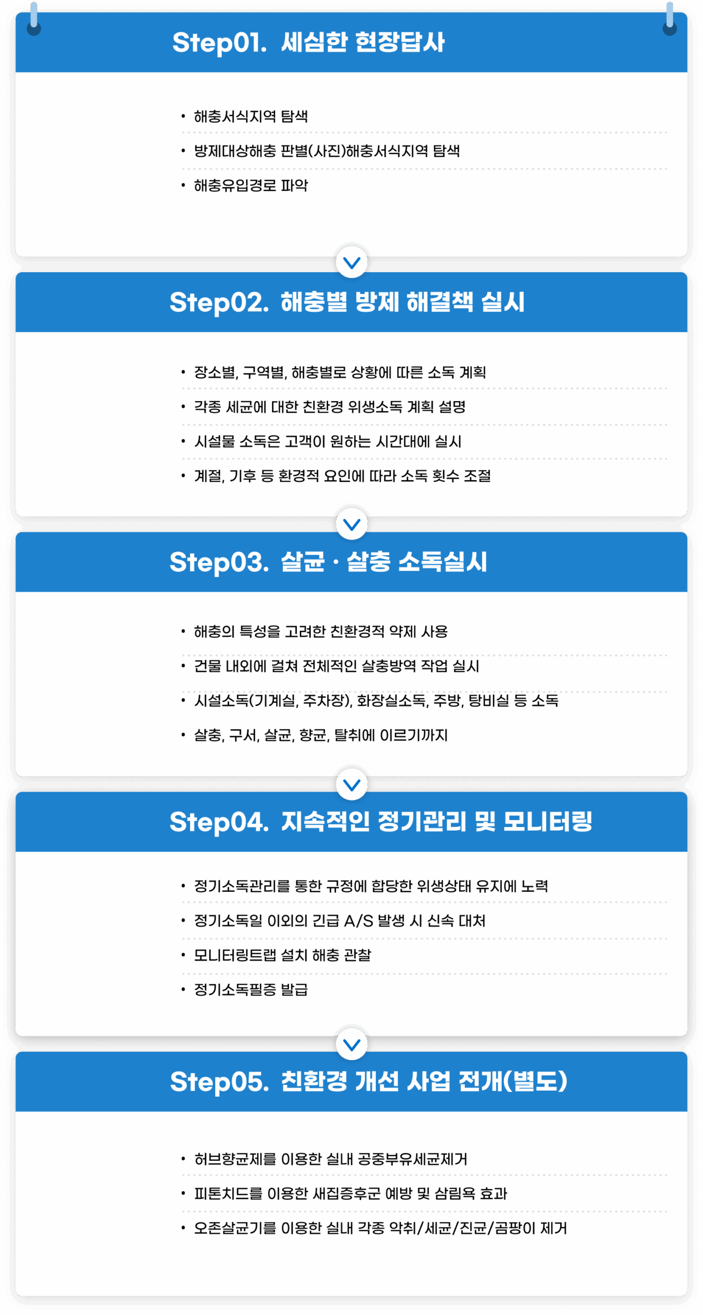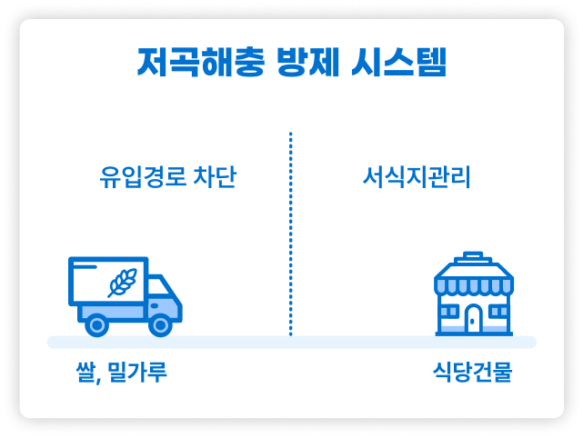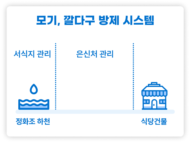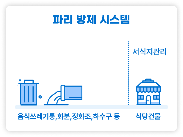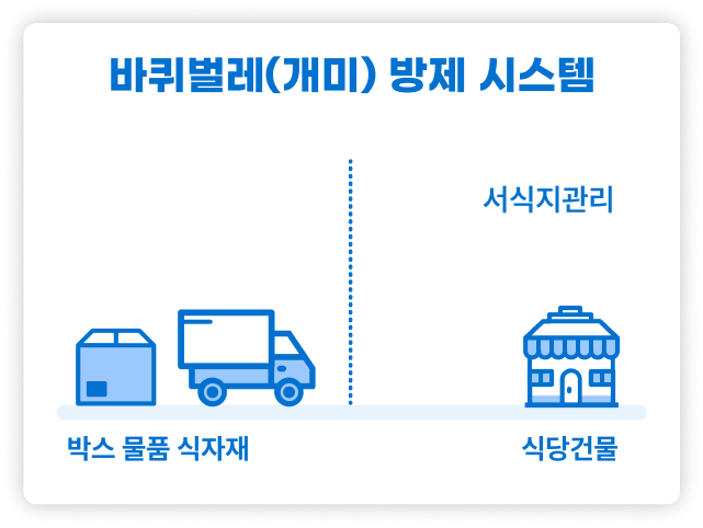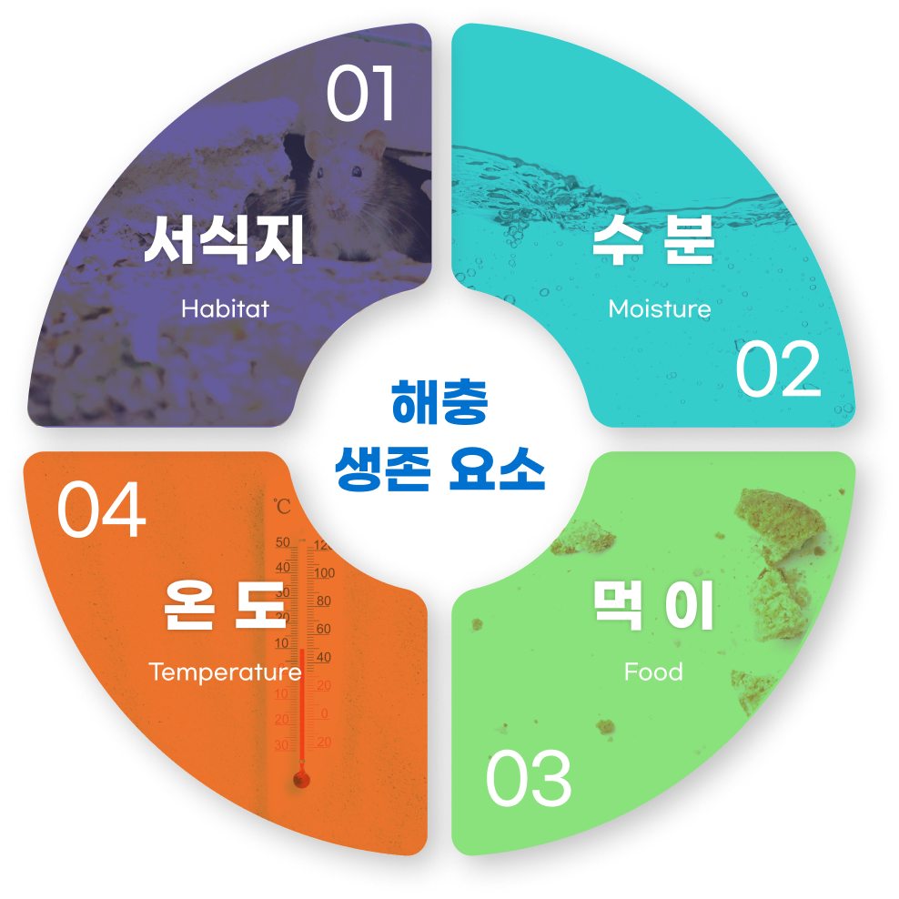해충이 생존에 필요한 요소 및 생태에 따라 방제 메뉴얼을 실시 해충없는 클린환경 조성